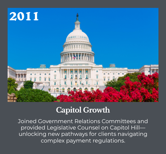 Joined Government Relations Committees and provided Legislative Counsel on Capitol Hill—unlocking new pathways for clients navigating complex payment regulations.