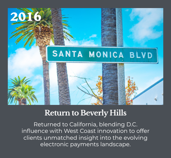 Returned to California, blending D.C. influence with West Coast innovation to offer clients unmatched insight into the evolving electronic payments landscape.