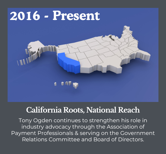 Since returning to California, Tony Ogden has deepened his commitment to industry advocacy through the Assoc. of Payment Professionals (formerly MAC). As a longtime member of the Government Relations Committee and a current Voting Member of the Board of Directors, he continues to champion regulatory engagement, organizational growth, and merchant-focused education alongside distinguished financial services leaders.